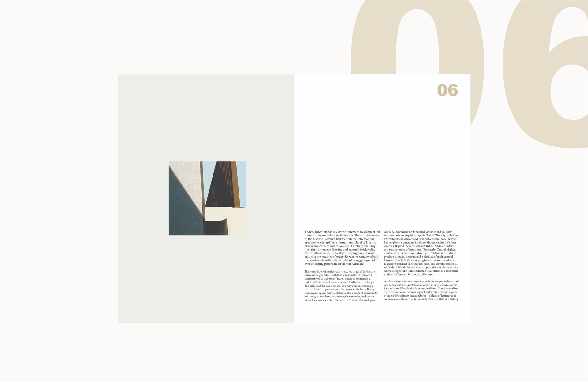 An exclusive multi spread editorial brochure for a new residential complex, aimed at potential viewers and buyers. Focussing on a concept of modern architecture with deep rooted foundations